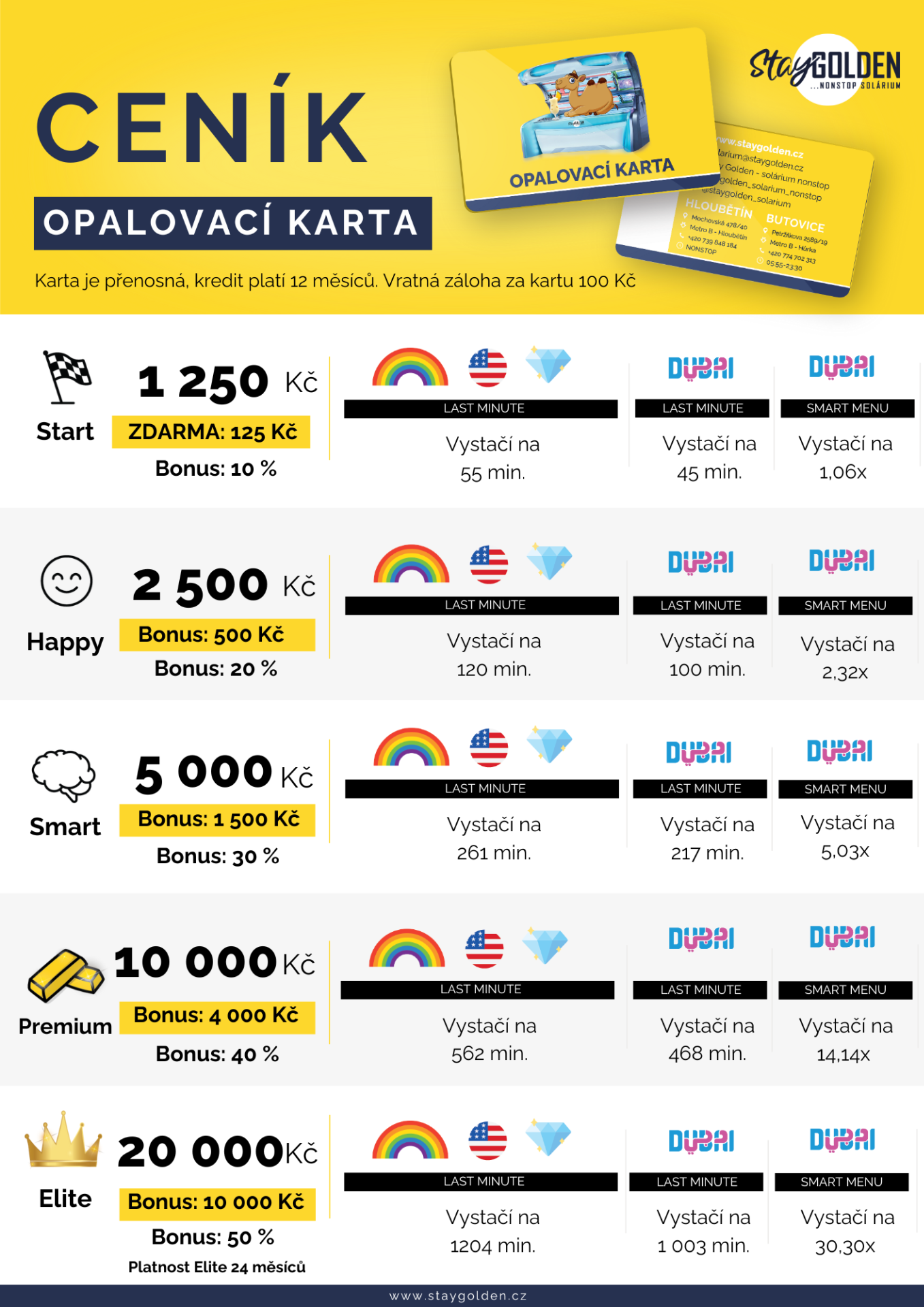 Abyste od nás odcházeli vždy krásně hnědí, opalovací trubice měníme za nové asi 3-násobně častěji, než se dělá v standardních soláriích. Díky tomu vám na krásné opálení stačí i menší počet minut. Od roku 2022 máme úplně nový typ opalovacích trubic, které